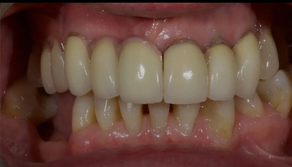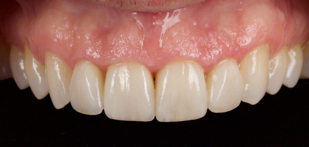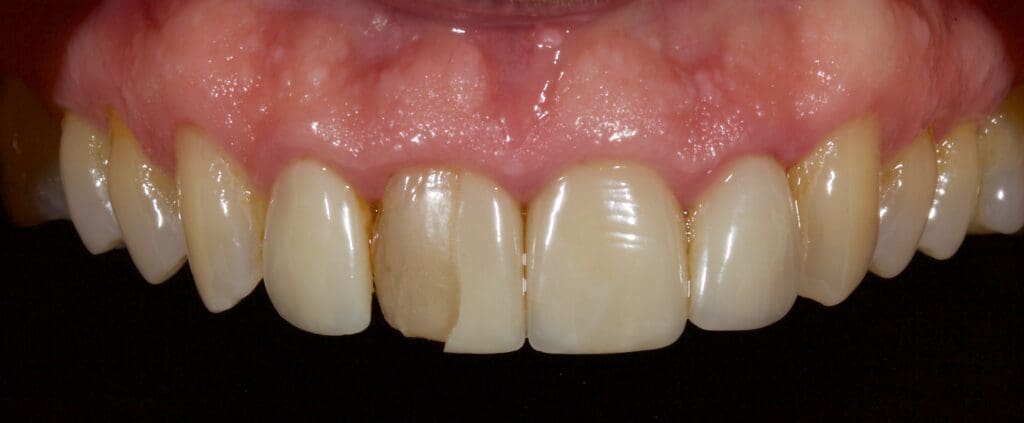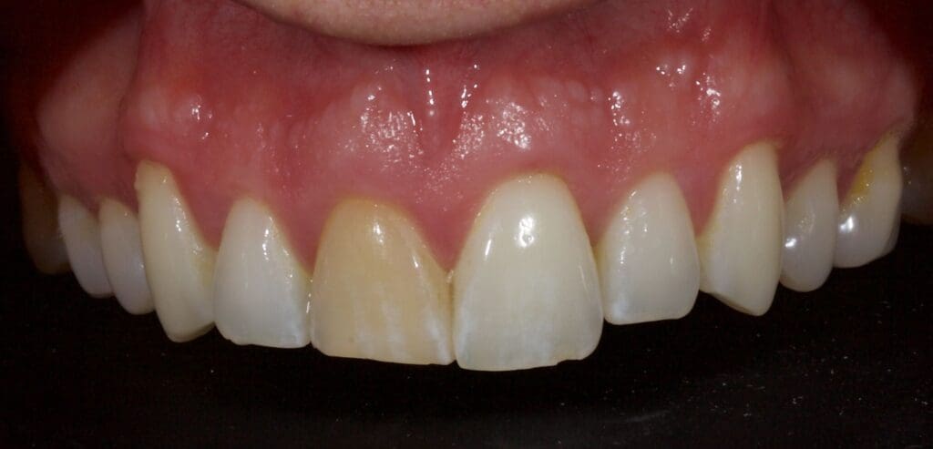 Discoloured tooth restored with resin after periodontal surgery by Dr Jason Smithson